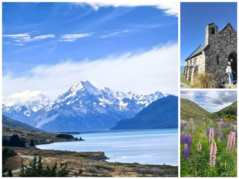 南島行的最后一天,車子沿著蒂卡波湖緩緩前行,離別的情緒輕輕漫上心頭。車窗外那片獨有的奶藍色湖水,安靜得不像話,卻在第一眼就撞進心底。岸邊的魯冰花早已過了盛放時節(jié),只剩幾縷淡淡的色彩,散落在微黃的草坡上。風掠過耳畔,那首熟悉的旋律忽然輕輕響起:“夜夜想起媽媽的話,閃閃淚光魯冰花……”一瞬間,異鄉(xiāng)的風也變得柔軟,連呼吸都裹著一絲想家的溫柔。